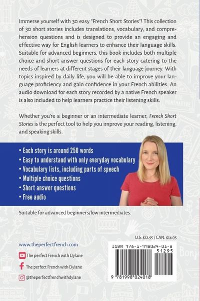 Do you struggle to find French reading material for beginners and intermediates? Look no further! Introducing French Short Stories! Improve your French with 30 easy French stories for beginners and intermediates. 30 short stories easily readable, covering everyday topics. The stories cover a variety of themes, including travel, friendship, family, and more. They are written in clear and concise language, making them easy to understand for beginners. The book also includes questions and answers for each story, allowing readers to test their comprehension and reinforce their understanding of the vocabulary. Read 1 story a day for 30 days and improve your French in only a month! French Short Stories has been written by a French teacher for French learners from beginner to intermediate level. Reading a story and answering the questions will take you less than 15 minutes a day. Each chapter includes: - A French short story easily readable with only 250 words and highlighted focused vocabulary to learn faster. - The English translation of each story. - Focused vocabulary including parts of speech, in French and in English. - Multiple choice questions for beginners. - Short answer questions for intermediate. But not only! At the end of the book, you will find a French-English glossary of all the highlighted vocabulary in the stories. Improve your listening skills Each story has been recorded in slow and clear French by a native French speaker (me). Download the audio of all the stories for free and start improving your French listening skills today. Grab your copy today and enjoy learning!