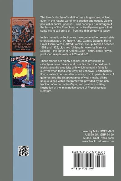 The term "cataclysm" is defined as a large-scale, violent event in the natural world, or a sudden and equally violent political or social upheaval. Such concepts run throughout the history of the French roman scientifique-a genre that some might call proto-sf-from the 18th century to today. In this thematic collection we have gathered ten remarkable short stories by J.-H. Rosny Aîné, Camille Debans, René Pujol, Pierre Véron, Alfred Franklin, etc., published between 1802 and 1928, plus two full-length novel by Maurice Leblanc-the father of Arsène Lupin-and Colonel Royet, published respectively in 1920 and 1928. These stories are highly original, each presenting a cataclysm more bizarre and complex than the next, each highlighting the creativity with which humanity fights for survival when faced with terrifying upheaval. Earthquakes, floods, extradimensional incursions, cosmic perils, bursts of gamma rays, the disappearance of vital metals, all are unique, albeit within the framework provided by the rich tradition of roman scientifique, and provide a striking illustration of the imaginative scope of French fantasy literature.