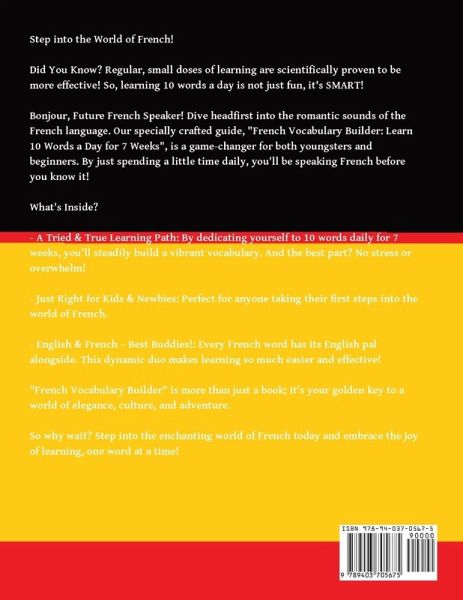 Delve into the captivating world of the French language with 'French Vocabulary Builder: Learn 10 Words a Day for 7 Weeks.' This book offers a perfect blend of structured learning, scientific-backed methods, and cultural enrichment.Scientific research supports the idea that daily, bite-sized lessons are highly effective for language retention. By committing to learning just 10 French words a day, you not only make the process manageable but also optimize your learning for better results. Small, consistent doses of learning have been proven to work wonders in boosting memory and comprehension.Whether you're a beginner or a young learner, this book is thoughtfully crafted to make your French journey delightful and fruitful. With a structured approach of 10 words a day for 7 weeks, complete with pronunciation, you'll steadily progress without feeling overwhelmed. This book is kid-friendly and beginner-centric, providing a smooth introduction to the French language. Every French wordis paired with its English counterpart, making the learning experience seamless and intuitive.Beyond just teaching words, this book offers a glimpse into the heart and soul of French culture, h