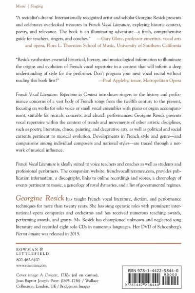 French Vocal Literature introduces singers to the history and performance concerns of a vast body of French songs from the sixteenth century to the present, focusing on songs for solo voice or small vocal ensemble with piano or organ accompaniment suitable for recital, concert, or church performance.