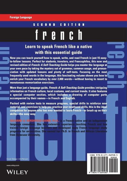 Learn to speak French like a native with this essential guide Now you can teach yourself how to speak, write, and read French in just 15 easy-to-follow lessons. Perfect for students, travelers, and Francophiles, this new and revised edition of French: A Self-Teaching Guide helps you master the language at your own pace by taking the mystery out of grammar, common usage, and pronunciation with updated lessons and plenty of self-tests. Focusing on the most frequently used words in the language, this fascinating volume shows you how to enrich your French vocabulary by over 2,000 words--without having to resort to monotonous memorization exercises.More than just a language guide, French: A Self-Teaching Guide provides intriguing information on French culture, local customs, and current trends. It also features a special computer section, which includes a drawing of computer parts accompanied by their names--in French and English. Packed with review tests to measure progress, special drills to reinforce new material, and exercises to help you practice your newfound skills, this is the ideal companion for anyone who has ever wanted to learn French--or brush up on their skills--the easy way.