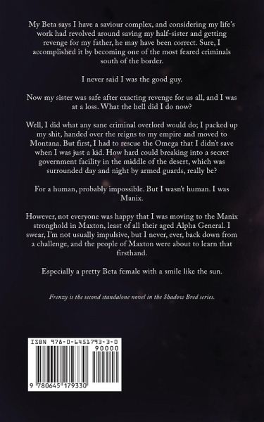 My Beta says I have a saviour complex, and considering my life's work had revolved around saving my half-sister and getting revenge for my father, he may have been correct. Sure, I accomplished it by becoming one of the most feared criminals south of the border. I never said I was the good guy. Now my sister was safe after exacting revenge for us all, and I was at a loss. What the hell did I do now? Well, I did what any sane criminal overlord would do; I packed up my stuff, handed over the reigns to my empire and moved to Montana. But first, I had to rescue the Omega that I didn't save when I was just a kid. How hard could breaking into a secret government facility in the middle of the desert, which was surrounded day and night by armed guards, really be? For a human, probably impossible. But I wasn't human. I was Manix. However, not everyone was happy that I was moving to the Manix stronghold in Maxton, least of all their aged Alpha General. I swear, I'm not usually impulsive, but I never, ever, back down from a challenge, and the people of Maxton were about to learn that firsthand. Especially a pretty Beta female with a smile like the sun. Frenzy is the second standalone novel in the Shadow Bred series.