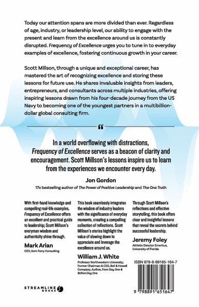 Today our attention spans are more divided than ever. Regardless of age, industry, or leadership level, the ability to fully engage with the present moment and learn from the excellence around us has been disrupted by countless distractions. Frequency of Excellence urges you to tune in to these everyday examples of excellence-fostering continuous learning and growth in your career. Scott Millson, through a unique and exceptional career, has mastered the art of tuning into these frequencies of excellence and has successfully distilled and stored them for reflection and utilization downstream. He learned invaluable lessons from a diverse array of leaders, entrepreneurs, salespeople, and consultants, which he generously shares in Frequency of Excellence.This book offers compelling, inspiring, and instructive lessons. Through powerful storytelling and remarkable examples of professional excellence, Millson shares a lifetime of insights accumulated across four decades and multiple industries-from his service in the US Navy to his ascent to become one of the youngest partners in a multi-billion dollar global consulting firm, and from founding his own consulting firm to ultimately selling it to a respected international organization. The lessons he experienced are meant to be shared, and he has done so masterfully within Frequency of Excellence.