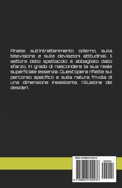 Analisi sull'intrattenimento odierno, sulla televisione e sulle deviazioni attitudinali. Il settore dello spettacolo è abbagliato dallo sfarzo, in grado di nascondere la sua reale superficiale essenza. Quest'opera riflette sul percorso specifico e sulla natura frivola di una dimensione inesistente, l'illusione dei desideri.