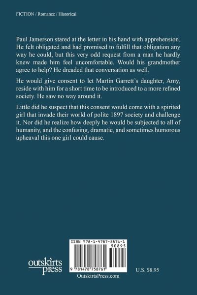 Paul Jamerson stared at the letter in his hand with apprehension. He felt obligated and had promised to fulfill that obligation any way he could, but this very odd request from a man he hardly knew made him feel uncomfortable. Would his grandmother agree to help? He dreaded that conversation as well. He would give consent to let Martin Garrett's daughter, Amy, reside with him for a short time to be introduced to a more refined society. He saw no way around it. Little did he suspect that this consent would come with a spirited girl that invade their world of polite 1897 society and challenge it. Nor did he realize how deeply he would be subjected to all of humanity, and the confusing, dramatic, and sometimes humorous upheaval this one girl could cause.
