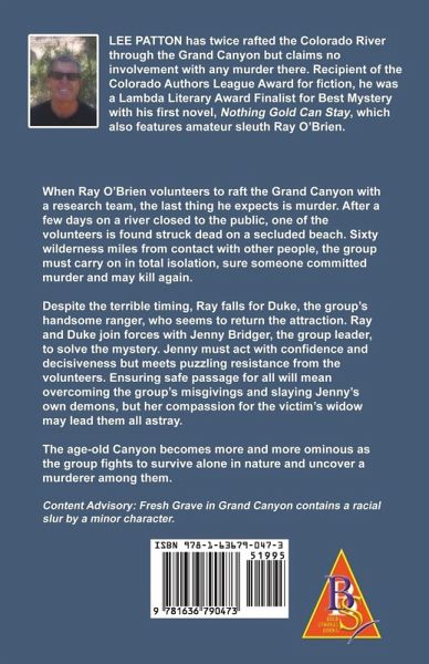 When Ray O'Brien volunteers to raft the Grand Canyon with a research team, the last thing he expects is murder. After a few days on a river closed to the public, one of the volunteers is found struck dead on a secluded beach. Sixty wilderness miles from contact with other people, the group must carry on in total isolation, sure someone committed murder and may kill again. Despite the terrible timing, Ray falls for Duke, the group's handsome ranger, who seems to return the attraction. Ray and Duke join forces with Jenny Bridger, the group leader, to solve the mystery. Jenny must act with confidence and decisiveness but meets puzzling resistance from the volunteers. Ensuring safe passage for all will mean overcoming the group's misgivings and slaying Jenny's own demons, but her compassion for the victim's widow may lead them all astray. The age-old Canyon becomes more and more ominous as the group fights to survive alone in nature and uncover a murderer among them. Fresh Grave in Grand Canyon contains a racial slur by a minor character.