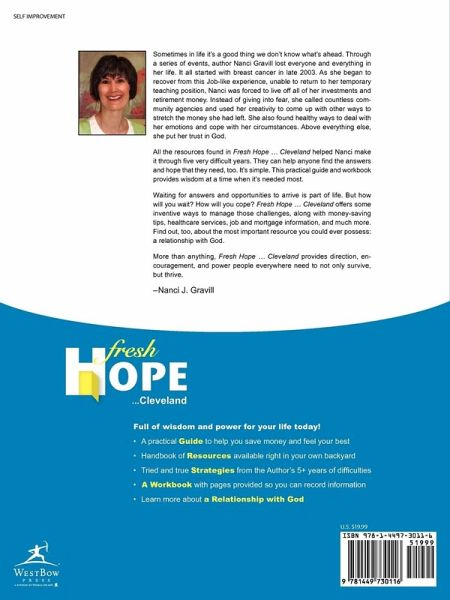Sometimes in life it's a good thing we don't know what's ahead. Through a series of events, Nanci Gravill lost everyone and everything in her life. It all started with breast cancer in late 2003. And as she began to recover from this Job-like experience, unable to return to her temporary teaching position, Nanci was forced to live off all of her investments and retirement money. Instead of giving into fear, she called countless community agencies and used her creativity to come up with other ways to stretch the money she had left. She also found healthy ways to deal with her emotions and cope with her circumstances. Above everything else, she put her trust in God. All the resources found in Fresh Hope … Cleveland helped Nanci make it through five very difficult years. They can help anyone find the answers and hope that they need too. It's simple. Fresh Hope … Cleveland provides wisdom at a time when it's needed most. Waiting for answers and opportunities to arrive is part of life. But how will you wait? How will you cope? Inside the pages of Fresh Hope … Cleveland you'll find some inventive ways to manage those challenges along with money-saving tips, healthcare services, job and mortgage information, and much more. Find out too, about the most important resource you could ever possess: a relationship with God. Is Fresh Hope … Cleveland just for Cleveland? No. Every resource in this comprehensive guide and workbook could be found too, in any city's own backyard. But more than anything, Fresh Hope … Cleveland provides direction, encouragement, and power people everywhere need to not only survive, but thrive. Whether life is great today or feels overwhelming, still, come explore some "fresh" ideas. Just one new idea could make everything even better than it was before. - Nanci J. Gravill Fresh Hope … Cleveland ~ full of wisdom and power for your life today! ¿ A practical Guide to help you save money and feel your best ¿ Handbook of Resources available right in your own backyard ¿ Tried and true Strategies from the author's 5+ years of difficulties ¿ A Workbook with pages provided so you can record more information ¿ Biblical References support concepts on emotional well-being ¿ A How-to-Book useful for anyone at any time