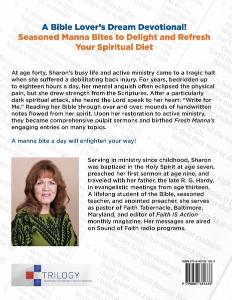 A Bible Lover's Dream Devotional! Seasoned Manna Bites to Delight and Refresh Your Spiritual Diet At age forty, Sharon's busy life and active ministry came to a tragic halt when she suffered a debilitating back injury. For years, bedridden up to eighteen hours a day, her mental anguish often eclipsed the physical pain, but she drew strength from the Scriptures. After a particularly dark spiritual attack, she heard the Lord speak to her heart: "Write for Me." Reading her Bible through over and over, mounds of handwritten notes flowed from her spirit. Upon her restoration to active ministry, they became comprehensive pulpit sermons and birthed Fresh Manna's engaging entries on many topics. A manna bite a day will enlighten your way!