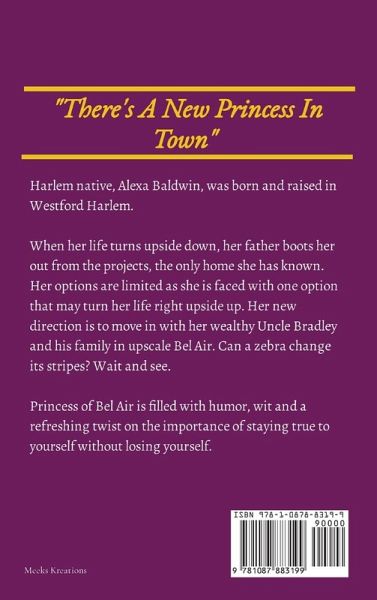 Harlem native, Alexa Baldwin, was born and raised in Westford Harlem. When her life turns upside down, her father boots her out from the projects, the only home she has known. Her options are limited as she is faced with one option that may turn her life right upside up. Her new direction is to move in with her wealthy Uncle Bradley and his family in upscale Bel Air. Can a zebra change its stripes? Wait and see. Princess of Bel Air is filled with humor, wit and a refreshing twist on the importance of staying true to yourself without losing yourself.
