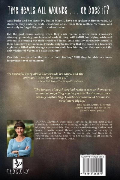 Time heals all wounds. . . or does it? Asia Butler and her sister, Ivy Butler Morelli, have not spoken in fifteen years. The two endured brutal emotional abuse from their mother, Veronica, and want only to forget the past . . . and each other. But the past comes calling when they each receive a letter from Veronica's attorney promising much needed cash if they will fulfill her dying wish and consent to cleaning out their childhood home. Asia and Ivy reluctantly return to their hometown of Emerson, Florida, only to discover the house is a hoarder's nightmare filled with strange mementos and clues hinting that they were not the only victims of Veronica's sadistic nature. Can this new pain be the path to their healing? Will they be able to choose forgiveness over resentment?