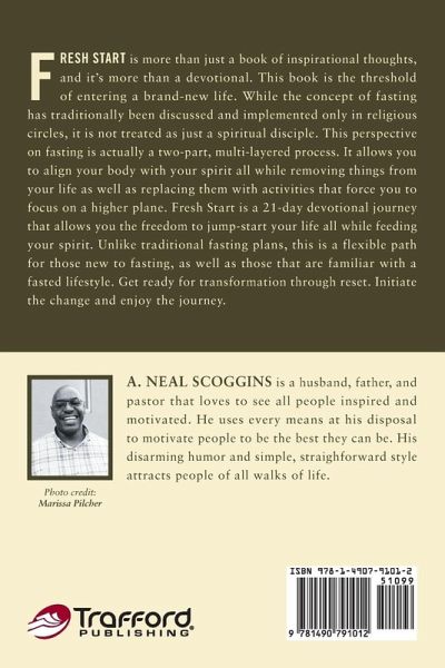 Fresh Start is more than just a book of inspirational thoughts, and it's more than a devotional. This book is the threshold of entering a brand-new life. While the concept of fasting has traditionally been discussed and implemented only in religious circles, it is not treated as just a spiritual disciple. This perspective on fasting is actually a two-part, multi-layered process. It allows you to align your body with your spirit all while removing things from your life as well as replacing them with activities that force you to focus on a higher plane. Fresh Start is a 21-day devotional journey that allows you the freedom to jump-start your life all while feeding your spirit. Unlike traditional fasting plans, this is a flexible path for those new to fasting, as well as those that are familiar with a fasted lifestyle. Get ready for transformation through reset. Initiate the change and enjoy the journey.
