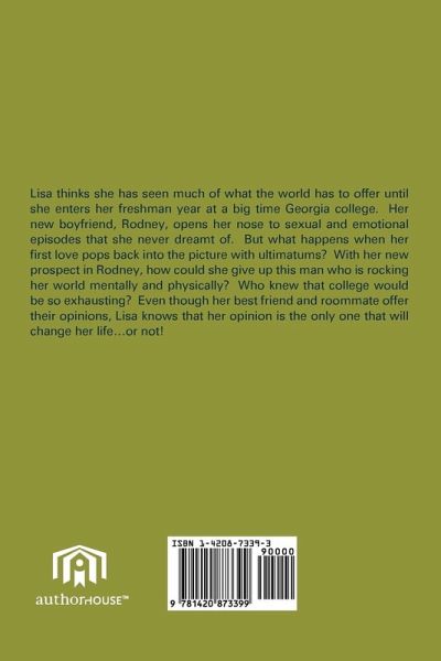 Lisa thinks she has seen much of what the world has to offer until she enters her freshman year at a big time Georgia college. Her new boyfriend, Rodney, opens her nose to sexual and emotional episodes that she never dreamt of. But what happens when her first love pops back into the picture with ultimatums? With her new prospect in Rodney, how could she give up this man who is rocking her world mentally and physically? Who knew that college would be so exhausting? Even though her best friend and roommate offer their opinions, Lisa knows that her opinion is the only one that will change her life.or not!