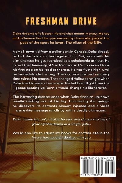 Deke dreams of a better life and that means money. Money and influence like the type earned by those who play at the peak of the sport he loves. The elites of the NBA. A small-town kid from a trailer park in Canada, Deke already had all the odds stacked against him. Yet, even with his slim chances he got recruited as a scholarship athlete. He joined the University of San Pandero in California and took his first step on his road to the top. He was flying high, until he landed-landed wrong. The doctor's planned recovery time ruined his season. That changed Halloween night when Deke tried to save a teammate. His hobbled flight from the goons beating up Ronnie would change his life forever. The harrowing escape ends when Deke finds an unknown needle sticking out of his leg. Uncovering the syringe he discovers its contents already injected and a video game-like message scrolls by with a deadly ultimatum. Deke makes the only choice he can, and downs the vial of glowing blue liquid in a single gulp...