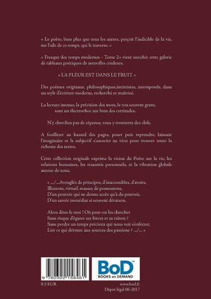 « Le poète, bien plus que tous les autres, perçoit l'indicible de la vie, sur l'aile de ce temps, qui le traverse. »« Fresque des temps modernes - Tome 2» vient enrichir cette galerie de tableaux poétiques de nouvelles couleurs.« LA FLEUR EST DANS LE FRUIT »Des poèmes originaux, philosophiques,intimistes, intemporels, dans un style d'écriture moderne, recherché et maîtrisé.La lecture intense, la précision des mots, le ton souvent grave,sont un électrochoc sur bien des certitudes.N'y cherchez pas de réponse, vous y trouverez des clefs.A feuilleter au hasard des pages, poser puis reprendre, laissant l'imaginaire et le subjectif s'associer au vécu pour trouver toute la richesse des textes.Cette collection originale exprime la vision du Poète sur la vie, les relations humaines, les ressentis personnels, et la vibration globale autour de nous.« .../...Aveuglés de principes, d'inaccessibles, d'avoirs,Illusions, virtuel, masses de possessions,D'un pouvoir qui ne donne accès qu'à du pouvoir,D'un savoir immédiat si souvent déraison.Alors dites-le moi ! Où peut-on les chercherSans risque d'égarer ses forces et sa raison ?Sans perdre un temps précieux qui nous voit s'enferrer,Lier ce qui déroute aux sources des passions ? .../... »