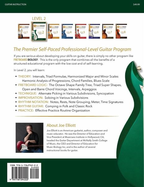 The Premier Self-Paced Professional-Level Guitar Program. If you are serious about developing your skills on guitar, there is simply no other program like FRETBOARD BIOLOGY. This is the only program that combines all the benefits of a structured educational program with the low cost and of self-learning. In Level 2, you will learn: ¿ THEORY: Intervals, Triad Formulas, Harmonized Major and Minor Scales Harmonic Analysis of Progressions, Chord Families, Blues Scale ¿ FRETBOARD LOGIC: The Octave Shape Family Tree, Triad Super Shapes, Open and Barre Chord Voicings, Intervals, Arpeggios ¿ TECHNIQUE: Alternate Picking in Various Subdivisions, Syncopation ¿ IMPROVISATION: Soloing in Various Subdivisions ¿ RHYTHM NOTATION: Notes, Rests, Note Grouping, Meter, Time Signatures ¿ RHYTHM GUITAR: Comping in Folk and Classic Rock ¿ PRACTICE: Effective Practice Routine Organization