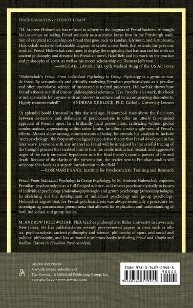 Freud: From Individual Psychology to Group Psychology, by M. Andrew Holowchak, explores Freudian psychoanalysis as a full-fledged science, as it relates psychoanalytically to issues of individual psychology (Individualpsychologie) and group psychology (Massenpsychologie). Holowchak analyzes Freud's shift in focus in his mature years away from psychoanalysis as a "curative" method for treating individual neurosis, to psychoanalysis as a full-fledged science of the human psyche that essays to shed light on group issues, such as religiosity and war.