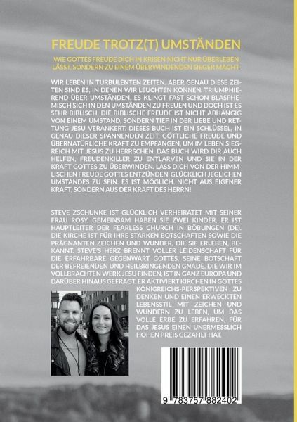 Wir leben in turbulenten Zeiten. Aber genau diese Zeiten sind es in denen wir leuchten können. Triumphierend über Umständen. Es klingt fast schon blasphemisch sich in den Umständen zu freuen und doch ist es sehr biblisch. Die biblische Freude ist nicht abhängig von einem Umstand sondern tief in der Liebe und Rettung Jesu verankert.Dieses Buch ist ein Schlüssel, in genau dieser spannenden Zeit, göttliche Freude und übernatürliche Kraft zu empfangen um im Leben siegreich mit Jesus zu herrschen. Das Buch wird dir auch helfen, Freudenkiller zu entlarven und sie in der Kraft Gottes zu überwinden.Lass dich von der himmlischen Freude Gottes entzünden, glücklich jeglichen Umstandes zu sein. Es ist möglich. Nicht aus eigener Kraft sondern aus der Kraft des Herrn!