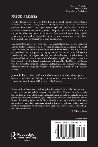 Freud's lifelong involvement with the Russian national character and culture is examined in James Rice's imaginative combination of history, literary analysis, and psychoanalysis. 'Freud's Russia' opens up the neglected "Eastern Front" of Freud's world--the Russian roots of his parents, colleagues, and patients. He reveals that the psychoanalyst was vitally concerned with the events in Russian history and its nineteenth-century cultural greats. Rice explores how this intense interest contributed to the evolution of psychoanalysis at every critical stage. Freud's mentor Charcot was a physician to the Tsar; his best friends in Paris were gifted Russian doctors; and some of his most valued colleagues (Max Eitingon, Moshe Wulff, Sabina Spielrein, and Lou Andreas-Salome) were also from Russia. These acquaintances intrigued Freud and precipitated his inquiry into the Russian psyche. Rice shows how Freud's major works incorporate elements, overtly and covertly, from his Russia. He describes Freud's most famous case, the Wolf-Man (Sergei Pankeev), and traces how his personality fused, in Freud's imagination, with that of Feodor Dostoevsky. Beyond this, Rice reveals the remarkable influence Dostoevsky had on Freud, surveying Freud's extensive library holdings and sources of biographical information on the Russian novelist. Initially inspired by the Freud-Jung letters that appeared in 1974, 'Freud's Russia' breaks new ground. Its fresh perspective will be of significant interest to psychoanalysts, historians of European culture, biographers of Freud, and students of Dostoevsky in comparative literature. It is a major work in fusing European intellectual history with the founding father of psychoanalysis.