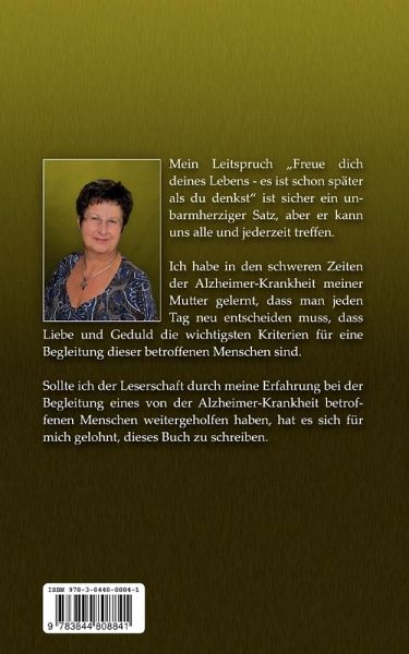 Mein Leitspruch "Freue dich deines Lebens - es ist schon später als du denkst" ist sicher ein unbarmherziger Satz, aber er kann uns alle und jederzeit treffen.Ich habe in den schweren Zeiten der Alzheimer-Krankheit meiner Mutter gelernt, dass man jeden Tag neu entscheiden muss, dass Liebe und Geduld die wichtigsten Kriterien für eine Begleitung dieser betroffenen Menschen sind. Sollte ich der Leserschaft durch meine Erfahrung bei der Begleitung eines von der Alzheimer-Krankheit betroffenen Menschen weitergeholfen haben, hat es sich für mich gelohnt, dieses Buch zu schreiben.