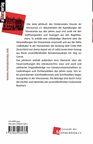 Das erste Jahrbuch des Fördervereins Freunde der Monacensia e.V. dokumentiert die Ausstellungen der Monacensia aus den Jahren 2007 und 2008 mit den Eröffnungsreden und Auszügen aus den Begleitbüchern. Es enthält eine vollständige Übersicht über die Veranstaltungen der Monacensia 2007/2008 und aus der Reihe "radioKultur in der Monacensia" die Sendung über Grete Weil Deutschland war ebenso kaputt wie ich selbst sowie einen Auszug aus ihrem unveröffentlichten Romanmanuskript Der Weg zur Grenze. Das Jahrbuch enthält außerdem eine Übersicht über die Neuerwerbungen des Literaturarchivs 2007 und 2008 und zahlreiche Originalbeiträge von Literaturwissenschaftlern zu Gedenktagen und Dichterjubiläen des Jahres 2009. Von allen porträtierten Schriftstellerinnen und Schriftstellern liegen Autografen in der Monacensia. Die Beiträge sind durch Fotos der Dichter und Faksimiles der unveröffentlichten Dokumente illustriert.