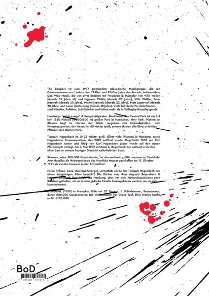 The Boppers ist eine 1977 gegründete schwedische Musikgruppe, die mit Coverversionen von Liedern der 1950er und 1960er Jahre durchbrach, insbesondere Doo Wop-Musik, die von zwei Brüdern mit Freunden in Hässelby von Ville Wallén (damals 19 Jahre alt) und Ingemar Wallén (damals 22 Jahre), Ville Wallén, Peter Jezewski (damals 20 Jahre), Michel Jezewski (damals 22 Jahre), Mats Lagerwall (damals 20 Jahre) und Lasse Westerberg (damals 18 Jahre). Viele berühmte Persönlichkeiten sind Künstler, Politiker, Schriftsteller und haben mehr als in Vällingby-Hässelby gelebt.Hamburgs "grüne Lunge" & Kungsträdgården, Stockholm? Der Central Park ist ein 3,4 km² (340 Hektar) (4.000x800 m) großer Park in Manhattan, New York. Planten un Blomen liegt im Herzen der Stadt, umgeben von Einkaufsstraßen, dem Kongresszentrum, der Messe. Ist 45 Hektar groß, seinem Namen alle Ehre: prächtige Pflanzen und Blumen Park.Tierpark Hagenbeck ist 19-25 Hektar groß, bietet viele Pflanzen in Hamburg, sowie Hagenbecks Tropenaquarium, das 2007 eröffnet wurde. Gegründet 1863 von Carl Hagenbeck senior und 1866 von Carl Hagenbeck junior wurde auf den neuen Pferdemarkt verlegt. Am 7. Mai 1907 entstand in Hagenbeck der weltweit erste Zoo ohne Bars an seinem heutigen Standort außerhalb der Stadt.Skansen, etwa 300.000 Quadratmeter, ist das weltweit größte museum in Stockholm Atur Hazelius als Nebengebäude des Nordiska Museet geschaffen am 11. Oktober 1891 als zweites Museum seiner Art eröffnet.Nicke nyfiken, Coco, (Curious George), vermutlich wurde der Tierpark Hagenbeck von einem neugierigen Affen besucht? Die Bücher von Hans Augusto Reyersbach & Margret Elizabeth Rey, beide aus Hamburg, aber vor dem Nationalsozialismus nach Brasilien geflohen, als sie in eine jüdische Familie hineingeboren wurden, wo sie sich kennenlernten.Graceland, (1939) in Memphis, USA mit 23 Zimmer, 8 Schlafzimmer, Badezimmer, davon 600.000 Quadratmeter. Die Vorbesitzerin war Grace Toof. Elvis Presley kaufte es für $100.000.