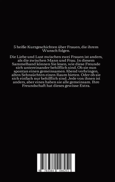 5 heiße Kurzgeschichten über Frauen, die ihrem Wunsch folgen.Die Liebe und Lust zwischen zwei Frauen ist anders, als die zwischen Mann und Frau. In diesem Sammelband können Sie lesen, wie diese Freunde sich untereinander behilflich sind. Ob sie nun spontan einen gemeinsamen Abend verbringen, alten Sehnsüchten einen Raum bieten. Oder ob sie sich einfach nur behilflich sind. Jede von ihnen ist anders, aber eines haben sie alle gemeinsam. Ihre Freundschaft hat dieses gewisse Extra.