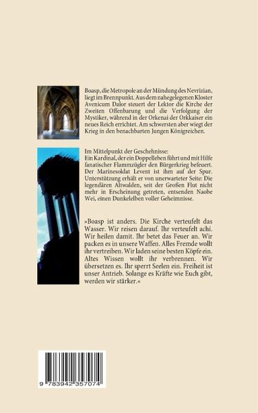 Boasp, die Metropole an der Mündung des Nevrizian, liegt im Brennpunkt. Aus dem nahegelegenen Kloster Avenicum Dalor steuert der Lektor die Kirche der Zweiten Offenbarung und die Verfolgung der Mystiker, während in der Orkenai der Orkkaiser ein neues Reich errichtet. Am schwersten aber wiegt der Krieg in den benachbarten Jungen Königreichen. Im Mittelpunkt der Geschehnisse: Ein Kardinal, der ein Doppelleben führt und mit Hilfe fanatischer Flammzügler den Bürgerkrieg befeuert. Der Marinesoldat Levent ist ihm auf der Spur. Unterstützung erhält er von unerwarteter Seite: Die legendären Altwalden, seit der Großen Flut nicht mehr in Erscheinung getreten, entsenden Naobe Wei, einen Dunkelelben voller Geheimnisse. »Boasp ist anders. Die Kirche verteufelt das Wasser. Wir reisen darauf. Ihr verteufelt achí. Wir heilen damit. Ihr betet das Feuer an. Wir packen es in unsere Waffen. Alles Fremde wollt ihr vertreiben. Wir laden seine besten Köpfe ein. Altes Wissen wollt ihr verbrennen. Wir übersetzen es. Ihr sperrt Seelen ein. Freiheit ist unser Antrieb. Solange es Kräfte wie Euch gibt, werden wir stärker.«