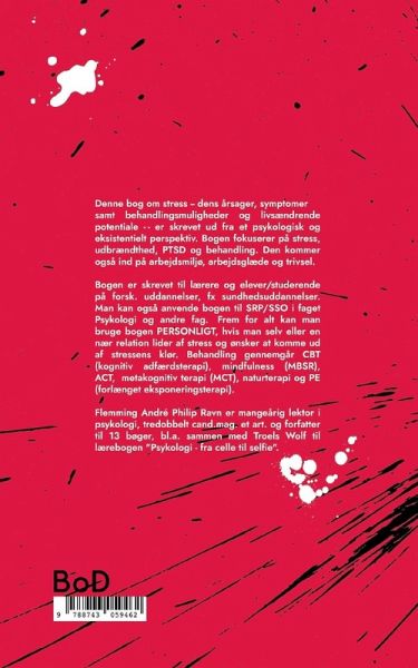 Denne bog om stress (dens årsager, symptomer, behandlingsmuligheder, nyorientering og livsændrende potentiale) er skrevet ud fra et psykologisk og eksistentielt perspektiv. Bogen fokuserer på forskellige former for stress og udbrændthed, herunder PTSD, og kommer også ind på arbejdsmiljø, arbejdsglæde og trivsel. Den er skrevet til lærere og elever/studerende på forsk. uddannelser, f.eks. sundhedsuddannelser. Man kan også anvende bogen til SSO el. SRP i faget Psykologi og andre fag. Frem for alt kan man bruge bogen personligt, hvis man selv eller en nær relation lider af stress og ønsker at komme ud af stressens klør. Behandling kommer bl.a. ind på CBT (kognitiv adfærdsterapi), ACT, mindfulness (MBSR), metakognitiv terapi (MCT), naturterapi og PE (forlænget eksponeringsterapi).