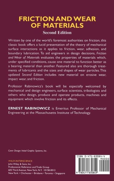Friction and Wear of Materials Second Edition Written by one of the world's foremost authorities on friction, this classic book offers a lucid presentation of the theory of mechanical surface interactions as it applies to friction, wear, adhesion, and boundary lubrication. To aid engineers in design decisions, Friction and Wear of Materials evaluates the properties of materials which, under specified conditions, cause one material to function better as a bearing material than another. Featured also are thorough treatments of lubricants and the sizes and shapes of wear particles. This updated Second Edition includes new material on erosive wear, impact wear, and friction. Professor Rabinowicz's book will be especially welcomed by mechanical and design engineers, surface scientists, tribologists and others who design, produce and operate products, machines and equipment which involve friction and its effects.