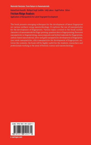 Chapter 1: Nanotechnology and Fingerprinting.- Chapter 2: Nanoparticles for Development & Detection of Fingerprints.- Chapter 3: Chemistry of Nanomaterials for finger printing.- Chapter 4: Quantum Dots in Fingerprinting.- Chapter 5: Florescent Nanoparticles in Fingerprinting.- Chapter 6: Nanocomposite and hybrid materials for fingerprints.- Chapter 7: Carbon based Nanomaterial.- Chapter 8: Silver & Gold Nanoparticles Development of Fingerprint.- Chapter 9: Zinc Oxide Nanoparticles (ZnO-NPs).- Chapter 10: Silica Nanoparticles for Development of Fingerprints.- Chapter 11: Iron Oxide for development of Fingerprints.- Chapter 12: Aluminum oxide nanoparticles for development of Fingerprints.- Chapter 13: Green synthesized nanoparticles for development of Latent Fingerprint.- Chapter 14: Smart material design and development of Fingerprint.- Chapter 15: functionalized nanomaterials use of development Fingerprint.- Chapter 16: Modeling and simulations involved in fingerprinting.