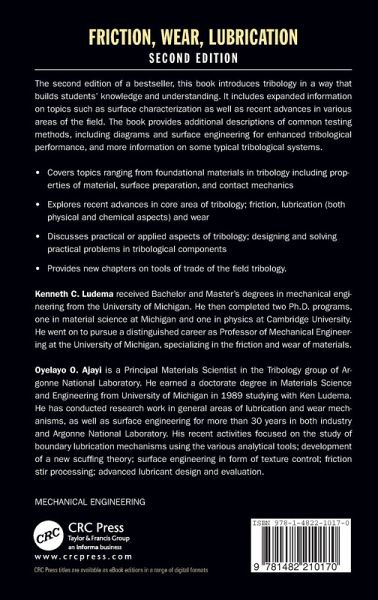 The second edition of a bestseller, this book introduces tribology in a way that builds students' knowledge and understanding. It includes expanded information on topics such as surface characterization as well as recent advances in the field. The book provides additional descriptions of common testing methods, including diagrams and surface texturing for enhanced lubrication, and more information on rolling element bearings. It also explores surface profile characterization and elastic plastic contact mechanics including wavy surface contact, rough surface contact models, friction and wear plowing models, and thermodynamic analysis of friction.
