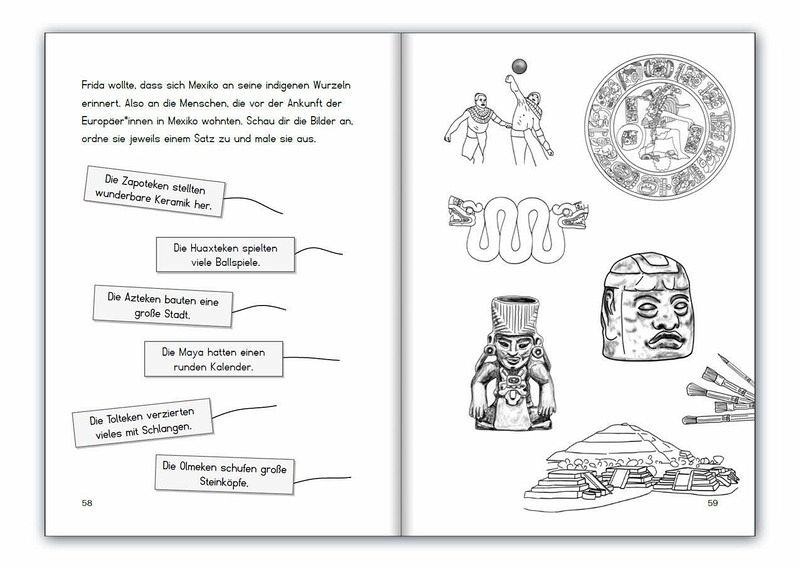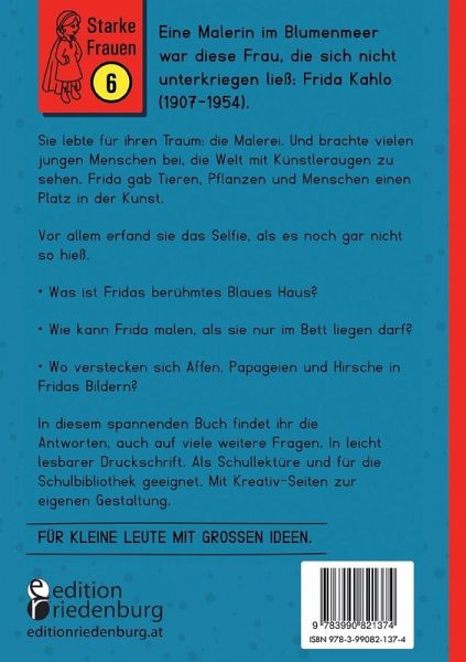 Eine Malerin im Blumenmeer war diese Frau, die sich nicht unterkriegen ließ: Frida Kahlo (1907-1954).Sie lebte für ihren Traum: die Malerei. Und brachte vielen jungen Menschen bei, die Welt mit Künstleraugen zu sehen. Frida gab Tieren, Pflanzen und Menschen einen Platz in der Kunst.Vor allem erfand sie das Selfie, als es noch gar nicht so hieß._ Was ist Fridas berühmtes Blaues Haus?_ Wie kann Frida malen, als sie nur im Bett liegen darf?_ Wo verstecken sich Affen, Papageien und Hirsche in Fridas Bildern?In diesem spannenden Buch findet ihr die Antworten, auch auf viele weitere Fragen. In leicht lesbarer Druckschrift. Als Schullektüre und für die Schulbibliothek geeignet. Mit Kreativ-Seiten zur eigenen Gestaltung.___Inhalt___Das Blaue Haus ... 6Eine glückliche Kindheit ... 8Eine echte Mexikanerin ... 10Ein schrecklicher Unfall ... 12Das neue Leben ... 14Herzensangelegenheiten ... 16Die USA - anders als gedacht? ... 18Tröstende Bilder ... 20Ich bin Künstlerin ... 22Die Welt ist schwarz ... 24Niemand malt wie Frida ... 26Von Frauen, Blumen und Tieren ... 28Frida als Lehrerin ... 30Das wahre Mexiko ... 32Allen Widrigkeiten zum Trotz ... 34Für ein starkes Mexiko ... 36Eine Frau, die fehlt ... 38Fridas Vermächtnis ... 40Solange wir uns erinnern ... 42Aus dem Schatten ... 44Hättest du's gewusst? ... 46Mach es zu deinem Buch! ... 51Pozole - ein mexikanisches Nationalgericht ... 62Noch nicht genug? ... 66Drei starke Frauen hinter diesem Buch ... 68Für kleine Leute mit großen Ideen.Band 6 der Reihe www.StarkeFrauen-Buch.deEin Titel vom Verlag www.editionriedenburg.at