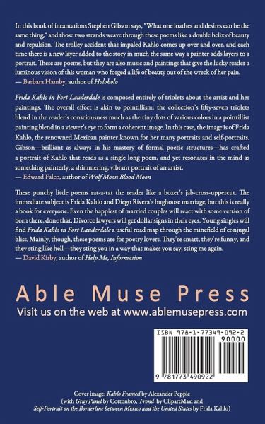 Reimagining the iconic Mexican artist's life and relationships, Stephen Gibson's Frida Kahlo in Fort Lauderdale explores Kahlo's passions and pains through vivid persona poems. Realized entirely in a modified triolet form, the collection is essentially an ekphrastic epic inspired by the paintings, photos, and personal effects on display in a 2015 Fort Lauderdale exhibition. Gibson probes the artist's inner world, giving voice to Kahlo's desires, anguish, and defiant spirit. He conjures her crippling injuries from a bus accident, her tumultuous marriage to Diego Rivera, and her affairs with Leon Trotsky and others, all filtered through her fervent art. This innovative collection brings Frida Kahlo's singular vision to life in visceral contemporary verse. PRAISE FOR FRIDA KAHLO IN FORT LAUDERDALE: In this book of incantations Stephen Gibson says, "What one loathes and desires can be the same thing," and those two strands weave through these poems like a double helix of beauty and repulsion. The trolley accident that impaled Kahlo comes up over and over, and each time there is a new layer added to the story in much the same way a painter adds layers to a portrait. These are poems, but they are also music and paintings that give the lucky reader a luminous vision of this woman who forged a life of beauty out of the wreck of her pain. - Barbara Hamby, author of Holoholo Frida Kahlo in Fort Lauderdale is composed entirely of triolets about the artist and her paintings. The overall effect is akin to pointillism: the collection's fifty-seven triolets blend in the reader's consciousness much as the tiny dots of various colors in a pointillist painting blend in a viewer's eye to form a coherent image. In this case, the image is of Frida Kahlo, the renowned Mexican painter known for her many portraits and self-portraits. Gibson-brilliant as always in his mastery of formal poetic structures-has crafted a portrait of Kahlo that reads as a single long poem, and yet resonates in the mind as something painterly, a shimmering, vibrant portrait of an artist. - Edward Falco, author of Wolf Moon Blood Moon These punchy little poems rat-a-tat the reader like a boxer's jab-cross-uppercut. The immediate subject is Frida Kahlo and Diego Rivera's bughouse marriage, but this is really a book for everyone. Even the happiest of married couples will react with some version of been there, done that. Divorce lawyers will get dollar signs in their eyes. Young singles will find Frida Kahlo in Fort Lauderdale a useful road map through the minefield of conjugal bliss. Mainly, though, these poems are for poetry lovers. They're smart, they're funny, and they sting like hell-they sting you in a way that makes you say, sting me again. - David Kirby, author of Help Me, Information ABOUT THE AUTHOR: Stephen Gibson's seventh poetry collection Self-Portrait in a Door-Length Mirror won the Miller Williams Poetry Prize, selected by Billy Collins. Earlier collections have won the Donald Justice Prize, Idaho Prize for Poetry, and the MARGIE Book Prize. His poems have appeared in such journals as Able Muse, American Arts Quarterly, the American Journal of Poetry, Boulevard, Cimarron Review, Copper Nickel, Court Green, the Evansville Review, EPOCH, Field, the Gettysburg Review, the Hudson Review, the Iowa Review, J Journal, Measure, New England Review, Notre Dame Review, the Paris Review, Pleiades, Ploughshares, Poetry, Prairie Schooner, Quiddity, Raleigh Review, Salamander, the Sewanee Review, Shenandoah, Southern Poetry Review, the Southern Review, Southwest Review, Upstreet, the Yale Review, and elsewhere.