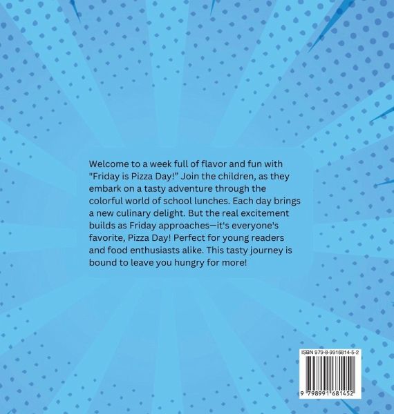 Welcome to a week full of flavor and fun with "Friday is Pizza Day!" Join the children, as they embark on a tasty adventure through the colorful world of school lunches. Each day brings a new culinary delight. But the real excitement builds as Friday approaches-it's everyone's favorite, Pizza Day! This tasty journey is bound to leave young readers hungry for more!