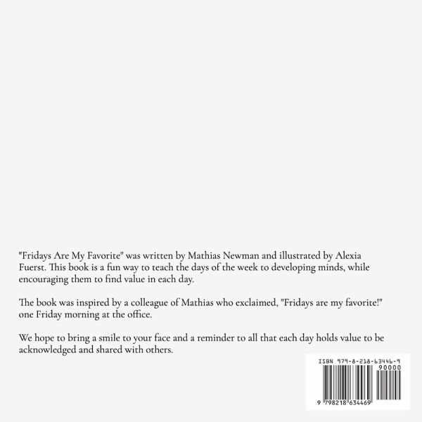 "Fridays Are My Favorite" was written by Mathias Newman and illustrated by Alexia Fuerst. This book is a fun way to teach the days of the week to developing minds, while encouraging them to find value in each day. The book was inspired by a colleague of Mathias who exclaimed, "Fridays are my favorite!" one Friday morning at the office. We hope to bring a smile to your face and a reminder to all that each day holds value to be acknowledged and shared with others.