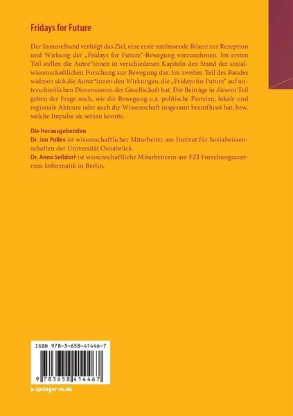 Fridays for Future zwischen follow the science und system change: Entwicklung einer politischen Bewegung.- Hintergründe und Dynamiken erfolgreicher Mobilisierung: Fridays for Future aus Sicht der Bewegungsforschung.- Zwischen politischem Protest und Selbsttransformation. Erziehungswissenschaftliche Perspektiven auf Fridays for Future.- Die (un)endliche Geschichte. Fridays for Future und die Klimakrise im medialen Diskurs. Eine Einordnung aus der Sicht der Medienforschung.- Forschungsüberblick.- "Wir sind kein Partikularinteresse." Über das unterschiedliche Politikverständnis von Fridays for Future und politische Parteien.- Vom Verschmelzen alter und neuer Konfliktlinien. Gesellschaftliche Polarisierung in der Auseinandersetzung um Energie- und Klimapolitik.- Parteireaktionen auf die Fridays for Future-Bewegung im Deutschen Bundestag.- Fridays for Future auf lokaler Ebene. Aktivität und Stärke der Ortsgruppen in deutschen Städten.- Zwischen 'Blahblahblah' in den Hallen und 'realem Wandel' auf den Straßen. Ein Feldbericht von Fridays for Future auf der COP26 in Glasgow.- Zwischen Effizienz und Basisdemokratie - Entscheidungen bei Fridays for Future.- Klimaberichterstattung im Wandel - Fridays for Future und die Medien.
