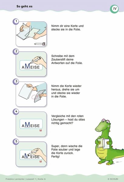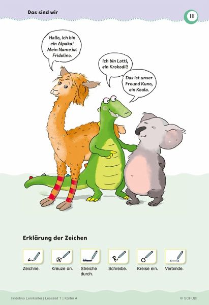 Üben, wischen, schlauer werden! Mit Zauberstift und Folie spielend leicht Lesen lernen. Lesezeit mit Fridolino Die Kartei A für das 1. Schuljahr stärkt zentrale Basiskompetenzen und begleitet die Kinder Schritt für Schritt auf ihrem Weg zur sicheren Lesefähigkeit. In vielfältigen Übungen trainieren die Kinder: * Linienführung und Feinmotorik - durch Nachspuren und Schwungübungen * Visuelle Wahrnehmung - mit Schattenbildern, Fehlerbildern oder Bildvergleichen * Buchstabenkenntnis - durch Suchspiele oder mit Buchstabenreihen * Phonem-Graphem-Zuordnung - Laute hören, Bilder zuordnen und Buchstaben erkennen * Silbenbewusstheit - schwingen, ergänzen, ordnen Im Mittelpunkt steht Fridolino, das freche Alpaka. Zusammen mit dem Krokodil Lotti und dem Koala Kuno bilden sie ein unschlagbares Team. Alle Vorteile auf einen Blick: * Passt perfekt zu jedem Lehrwerk. * Die Lösungen auf der Rückseite ermöglichen eine Selbstkontrolle. * Die Kartei ist sofort einsatzbereit und wiederverwendbar - kein Kopieren nötig. * Vielfältig einsetzbar: Regel- und Förderunterricht, Freiarbeit, Wochenplan, Stationsarbeit, Selbstlernphasen, Nachmittagsbetreuung und zur Differenzierung. Lesen lernen mit Fridolino: individuell, flexibel und motivierend! Inhalt: 40 stabile Übungskarten, Lernübersicht und Hinweise für Lehrkräfte in praktischer Mappe, inklusive 1 Folie und 1 Zauberstift. So funktioniert die Arbeit mit der Kartei: 1. Karte auswählen und in die Folie stecken. 2. Die Lösungen mit dem Zauberstift auf die Folie schreiben. 3. Karte herausnehmen, umdrehen und wieder in die Folie stecken. - Jetzt können die Kinder mithilfe der roten Lösungen auf der Rückseite ihre Antworten vergleichen. 4. Folie mit dem am Stift integrierten Filzteil abwischen und Karte zurücklegen. Die Fridolino Lernkartei: schnell und ohne Vorbereitungsaufwand einsetzbar, einfaches Prinzip, ressourcenschonend.