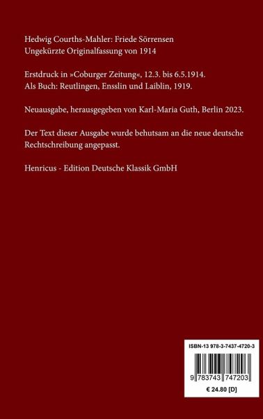 Hedwig Courths-Mahler: Friede Sörrensen. Ungekürzte Originalfassung von 1914Erstdruck in »Coburger Zeitung«, 12.3. bis 6.5.1914. Zwischen Fortsetzungsnummer 17 und 18 fehlt eine Textpassage, die aus einem späteren Druck nachgetragen wurde. Als Buch: Reutlingen, Ensslin und Laiblin, 1919.Neuausgabe, herausgegeben von Karl-Maria Guth, Berlin 2023.Der Text dieser Ausgabe wurde behutsam an die neue deutsche Rechtschreibung angepasst.Umschlagabbildung: Thomas Eakins, Clara, um 1900Gesetzt aus der Minion Pro, 11 pt.Die Sammlung Hofenberg erscheint im Verlag Henricus - Edition Deutsche Klassik GmbH, Berlin