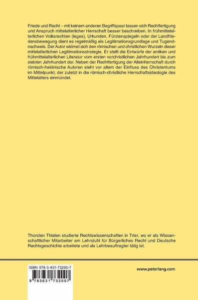 Friede und Recht - mit keinem anderen Begriffspaar lassen sich Rechtfertigung und Anspruch mittelalterlicher Herrschaft besser beschreiben. In frühmittelalterlichen Volksrechten (leges), Urkunden, Fürstenspiegeln oder der Landfriedensbewegung dient es regelmäßig als Legitimationsgrundlage und Tugendnachweis. Der Autor widmet sich den römischen und christlichen Wurzeln dieser mittelalterlichen Legitimationsstrategie. Er stellt die Entwürfe der antiken und frühmittelalterlichen Literatur vom ersten vorchristlichen Jahrhundert bis zum siebten Jahrhundert dar. Neben der Rechtfertigung der Alleinherrschaft durch römisch-heidnische Autoren steht vor allem der Einfluss des Christentums im Mittelpunkt, der zuletzt in die römisch-christliche Herrschaftsideologie des Mittelalters einmündet.