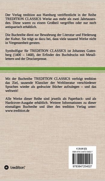 Diese Hardcover-Ausgabe ist Teil der TREDITION CLASSICS. Der Verlag tredition aus Hamburg veröffentlicht in der Buchreihe TREDITION CLASSICS Werke aus mehr als zwei Jahrtausenden. Diese waren zu einem Großteil vergriffen oder nur noch antiquarisch erhältlich. Mit TREDITION CLASSICS verfolgt tredition das Ziel, tausende Klassiker der Weltliteratur verschiedener Sprachen wieder als gedruckte Bücher zu verlegen und das weltweit! Die Buchreihe dient zur Bewahrung der Literatur und Förderung der Kultur. Sie trägt so dazu bei, dass viele tausend Werke nicht in Vergessenheit geraten.