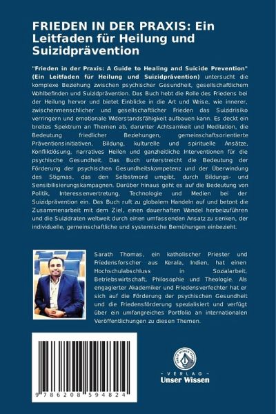 "Frieden in der Praxis: A Guide to Healing and Suicide Prevention" (Ein Leitfaden für Heilung und Suizidprävention) untersucht die komplexe Beziehung zwischen psychischer Gesundheit, gesellschaftlichem Wohlbefinden und Suizidprävention. Das Buch hebt die Rolle des Friedens bei der Heilung hervor und bietet Einblicke in die Art und Weise, wie innerer, zwischenmenschlicher und gesellschaftlicher Frieden das Suizidrisiko verringern und emotionale Widerstandsfähigkeit aufbauen kann. Es deckt ein breites Spektrum an Themen ab, darunter Achtsamkeit und Meditation, die Bedeutung friedlicher Beziehungen, gemeinschaftsorientierte Präventionsinitiativen, Bildung, kulturelle und spirituelle Ansätze, Konfliktlösung, narratives Heilen und ganzheitliche Interventionen für die psychische Gesundheit. Das Buch unterstreicht die Bedeutung der Förderung der psychischen Gesundheitskompetenz und der Überwindung des Stigmas, das den Selbstmord umgibt, durch Bildungs- und Sensibilisierungskampagnen. Darüber hinaus geht es auf die Bedeutung von Politik, Interessenvertretung, Technologie und Medien bei der Suizidprävention ein. Das Buch ruft zu globalem Handeln auf und betont die Zusammenarbeit mit dem Ziel, einen dauerhaften Wandel herbeizuführen und die Suizidraten weltweit durch einen umfassenden Ansatz zu senken, der individuelle, gemeinschaftliche und systemische Bemühungen einbezieht.