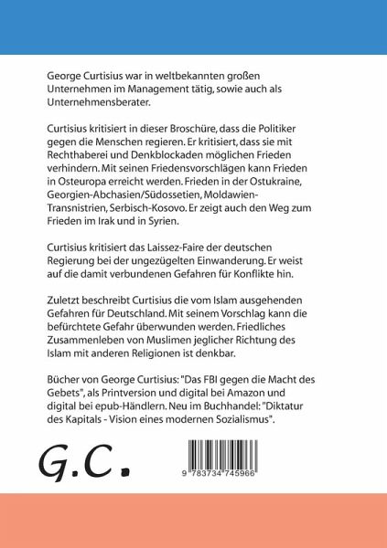 In dieser Broschüre kritisiert George Curtisius, dass die Politiker über die Köpfe der Menschen hinweg regieren. Durch Rechthabenwollen und Denkblockaden der Politiker wird vielfach möglicher Frieden verhindert. Territoriale Integrität wird über das Selbstbestimmungsrecht der Menschen gestellt. So kann es keinen Frieden geben. Curtisius erklärt, wie die Denkblockade der territorialen Integrität überwunden werden kann. Er macht Friedensvorschläge für die Ostukraine, für Georgien-Abchasien/Südossetien, Moldawien-Transnistrien und Serbisch-Kosovo. In ähnlicher Weise unterbreitet Curtisius Friedensvorschläge für den Irak und für Syrien. Curtisius kritisiert das Laissez-Faire der deutschen Regierung bei der ungezügelten Einwanderung. Er weist auf die damit verbundenen Gefahren für Konflikte hin. Zuletzt beschreibt Curtisius die vom Islam ausgehenden Gefahren für Deutschland. Der Islam wird teilweise als Bedrohung wahrgenommen. Curtisius bietet einen Lösungsvorschlag an. Religionsgelehrte des Islam sollen nachweisen, dass der von ihnen gelehrte und gepredigte Islam ein friedliches Zusammenleben mit allen anderen Religionen in Deutschland ermöglicht.