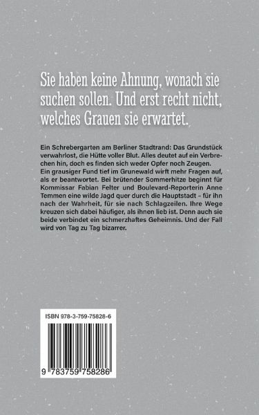Ein Schrebergarten am Berliner Stadtrand: Das Grundstück verwahrlost, die Hütte voller Blut. Alles deutet auf ein Verbrechen hin, doch es finden sich weder Opfer noch Zeugen. Ein grausiger Fund tief im Grunewald wirft mehr Fragen auf, als er beantwortet. Bei brütender Sommerhitze beginnt für Kommissar Fabian Felter und Boulevard-Reporterin Anne Temmen eine wilde Jagd quer durch die Hauptstadt - für ihn nach der Wahrheit, für sie nach Schlagzeilen. Ihre Wege kreuzen sich dabei häufiger, als ihnen lieb ist. Denn auch sie beide verbindet ein schmerzhaftes Geheimnis. Und der Fall wird von Tag zu Tag bizarrer.