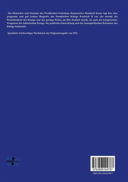 Der Historiker und Direktor des Preußischen Geheimen Staatsarchivs Reinhold Koser legt hier eine prägnante und gut lesbare Biografie des Preußischen Königs Friedrich II vor, die sowohl die Persönlichkeit des Königs und das geistige Klima am Hof deutlich macht, als auch die kriegerischen Ereignisse der Schlesischen Kriege, die politische Entwicklung und die innenpolitischen Reformen des Königs behandelt.