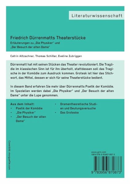 Fachbuch aus dem Jahr 2013 im Fachbereich Germanistik - Neuere Deutsche Literatur, , Sprache: Deutsch, Abstract: Dürrenmatt hat mit seinen Stücken das Theater revolutioniert. Die Tragödie im klassischen Sinn ist für ihn überholt, stattdessen soll das Tragische in der Komödie zum Ausdruck kommen. Grotesk ist hier das Stichwort, das Mittel, dessen er sich für seine Theaterstücke bedient.In diesem Band erfahren Sie mehr über Dürrenmatts Poetik der Komödie. Im Speziellen werden dabei "Die Physiker" und "Der Besuch der alten Dame" unter die Lupe genommen.Aus dem Inhalt: Poetik der Komödie, "Die Physiker", "Der Besuch der alten Dame", Dramentheoretische Studien und Deutungsversuche, Das Groteske