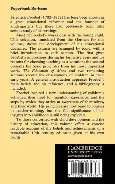 Acknowledgements Editor's notes Part I. Introduction: 1. Froebel's educational ideas 2. The Froebelian movement 3. Texts, translations and major critiques Part II. Vocation: 4. Letter to the Duke of Meiningen 5. Letter to Karl Christoph Friedrich Krause 6. Letter to the women in Keilhau Part III. The Education of Man: General Principles: 7. The Education of Man Part IV. The Young Child: 8. Summary of the story of a child's development during the first period of life 9. The small child, or the importance of a baby's activities 10. The Education of Man: in childhood 11. Pedagogics of the Kindergarten 12. Outline of a plan for founding and developing a Kindergarten Part V. The Child and the School: 13. The Education of Man: in boyhood 14. Plan of an institution for the education of the poor in the canton of Berne Chronological table Select bibliography Index.