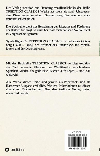 Dieses Werk ist Teil der Buchreihe TREDITION CLASSICS. Der Verlag tredition aus Hamburg veröffentlicht in der Buchreihe TREDITION CLASSICS Werke aus mehr als zwei Jahrtausenden. Diese waren zu einem Großteil vergriffen oder nur noch antiquarisch erhältlich. Mit der Buchreihe TREDITION CLASSICS verfolgt tredition das Ziel, tausende Klassiker der Weltliteratur verschiedener Sprachen wieder als gedruckte Bücher zu verlegen und das weltweit! Die Buchreihe dient zur Bewahrung der Literatur und Förderung der Kultur. Sie trägt so dazu bei, dass viele tausend Werke nicht in Vergessenheit geraten.