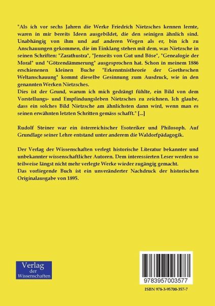 "Als ich vor sechs Jahren die Werke Friedrich Nietzsches kennen lernte, waren in mir bereits Ideen ausgebildet, die den seinigen ähnlich sind. Unabhängig von ihm und auf anderen Wegen als er, bin ich zu Anschauungen gekommen, die im Einklang stehen mit dem, was Nietzsche in seinen Schriften: "Zarathustra", "Jenseits von Gut und Böse", "Genealogie der Moral" und "Götzendämmerung" ausgesprochen hat. Schon in meinem 1886 erschienenen kleinen Buche "Erkenntnistheorie der Goetheschen Weltanschauung" kommt dieselbe Gesinnung zum Ausdruck, wie in den genannten Werken Nietzsches.