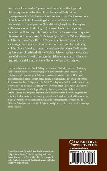 Friedrich Schleiermacher's groundbreaking work in theology and philosophy was forged in the cultural ferment of Berlin at the convergence of the Enlightenment and Romanticism. The three sections of this book include illuminating sketches of Schleiermacher's relationship to contemporaries (Mendelssohn, Hegel and Kierkegaard), his work as public theologian (dialogue on Jewish emancipation, founding the University of Berlin) as well as the formation and impact of his two most famous books, On Religion: Speeches to its Cultured Despisers and The Christian Faith. Richard Crouter examines Schleiermacher's stance regarding the status of doctrine, Church and political authority, and the place of theology among the academic disciplines. Dedicated to the Protestant Church in the line of Calvin, Schleiermacher was equally a man of the university who brought the highest standards of rationality, linguistic sensitivity and a sense of history to bear upon religion.
