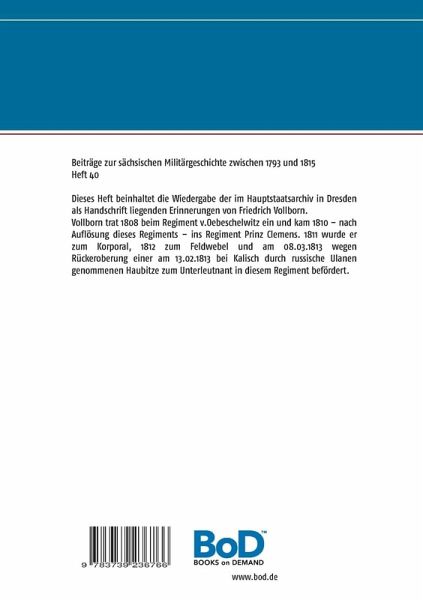 Dieses Heft beinhaltet die Wiedergabe der im Hauptstaatsarchiv in Dresden als Handschrift liegenden Erinnerungen von Friedrich Vollborn. Vollborn trat 1808 beim Regiment v.Oebeschelwitz ein und kam 1810 - nach Auflösung dieses Regiments - ins Regiment Prinz Clemens. 1811 wurde er zum Korporal, 1812 zum Feldwebel und am 08.03.1813 wegen Rückeroberung einer am 13.02.1813 bei Kalisch durch russische Ulanen genommenen Haubitze zum Unterleutnant in diesem Regiment befördert.
